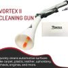 The Vortex II Blow Gun Dry Cleaning Tool works without the water or chemicals by using a tornado-like motion powered by your air compressor operating between 60 and 90 psi. The flexible counter-weighted tube housed inside a hard, rigid plastic cone provides the air velocity to get the job done fast!